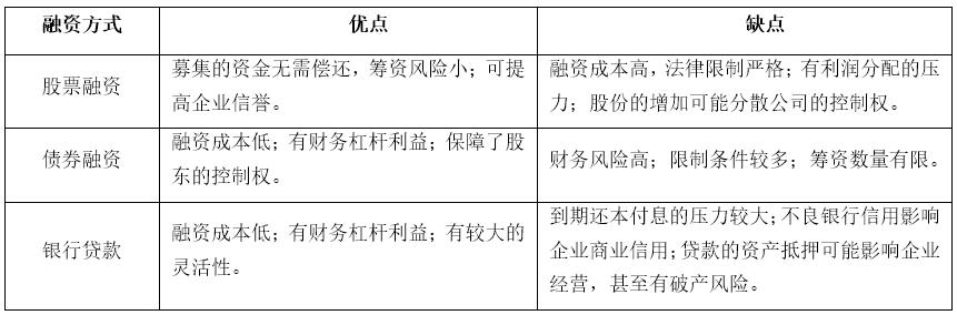 資本籌措戰(zhàn)略也稱融資戰(zhàn)略,即根據(jù)企業(yè)的經(jīng)營資金需求和特定的融資環(huán)境進行分析,確定最佳的融資規(guī)模、資本結(jié)構(gòu)和融資方式的財務(wù)戰(zhàn)略。選擇有利的融資渠道和方法,可以降低資金成本,提高借入資金使用效率。融資戰(zhàn)略方案的選擇應(yīng)在綜合考慮融資數(shù)額、期限、利率、風(fēng)險等各種因素的基礎(chǔ)上進行,最常見的融資方式有股票融資、債券融資和銀行貸款三種。它們的優(yōu)缺點見下表: