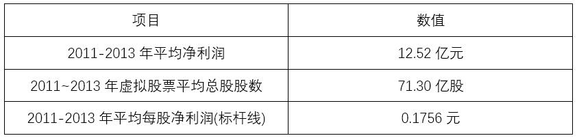 考慮到電力行業(yè)外部環(huán)境因素波動的周期性(如煤價),為盡可能平抑周期性波動,本方案以2011-2013年虛擬股票的平均每股凈利潤為標(biāo)桿線。