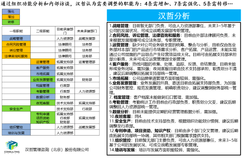 通過戰(zhàn)略方向、外部標(biāo)桿、核心價(jià)值鏈、APQC流程框架、部門現(xiàn)有工作等維度進(jìn)行分析研究,結(jié)合企業(yè)當(dāng)前發(fā)展階段的實(shí)際情況,項(xiàng)目組提出組織崗位優(yōu)化建議。