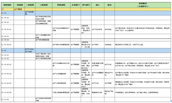 第三階段:主要為二批流程優(yōu)化、流程配套文件編寫,包含生產(chǎn)管理、采購、倉儲、交付、技術(shù)服務、質(zhì)量等流程設(shè)計(含表單)。
