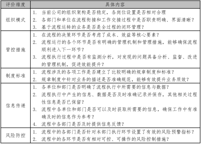 針對(duì)以上五個(gè)要素針對(duì)流程進(jìn)行評(píng)估,實(shí)際上是對(duì)流程所定位的業(yè)務(wù)的一種系統(tǒng)化的審視,將流程的運(yùn)行與公司組織架構(gòu)的匹配性、管控措施的具體性、制度標(biāo)準(zhǔn)的準(zhǔn)確性、信息傳遞的通暢性、風(fēng)險(xiǎn)防控的有效性進(jìn)行了密切關(guān)聯(lián)。一項(xiàng)好的流程,必然是在以上五個(gè)方面的能夠很好的契合公司的部門和崗位設(shè)置,職責(zé)分工明確、各項(xiàng)支撐文件完備,并且促使該項(xiàng)業(yè)務(wù)高效有序運(yùn)轉(zhuǎn)。