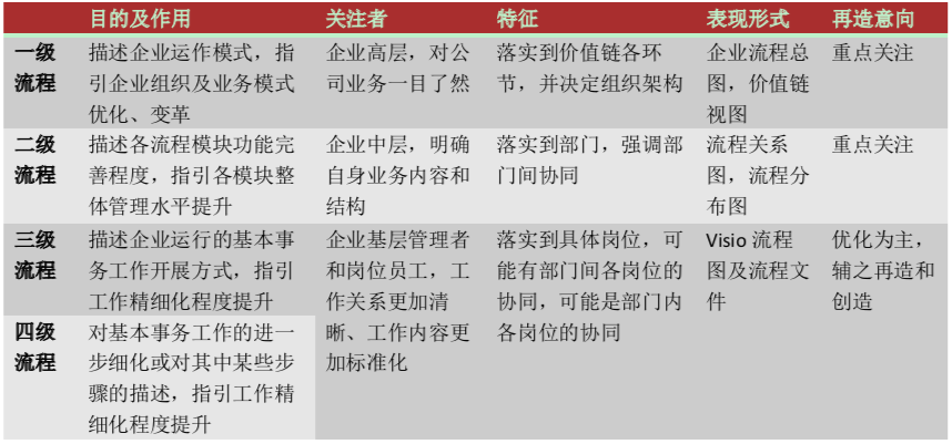 流程具有典型的層次性特征,不同層級的流程,其功能不同,以下表格分別從流程的目的及作用、關(guān)注者、流程特征、流程表現(xiàn)形式、流程再造意向五個方面進行了詳細對比,希望能夠使讀者能夠更加深入的理解為何要對流程進行分級。