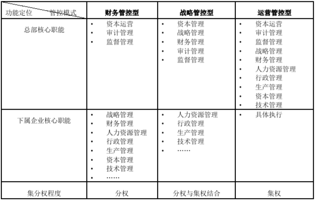 三種集團(tuán)管控模式體現(xiàn)了對(duì)總部功能的不同定位: