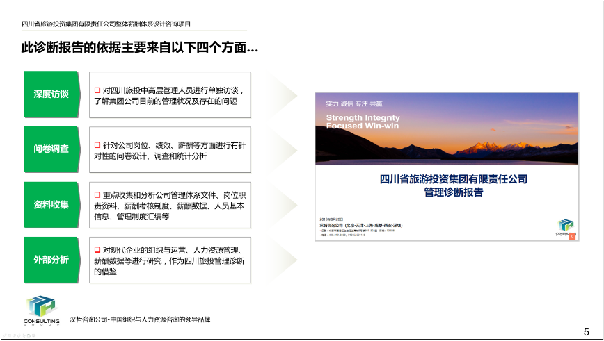 項(xiàng)目啟動后,項(xiàng)目組通過深度訪談、問卷調(diào)查、資料收集、外部分析四個方面對集團(tuán)現(xiàn)狀進(jìn)行全面診斷,發(fā)現(xiàn)目前存在的問題并提出四大核心舉措,明確改進(jìn)思路。