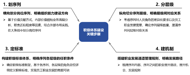 一個完整的職級體系建設項目,應主要包括“劃序列-分層級-定標準-建機制”四個操作步驟。下面筆者擬從上述四個關鍵步驟入手,結(jié)合項目實踐經(jīng)驗,對上述問題進行探討。