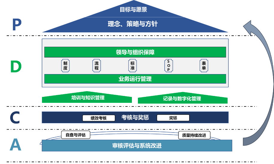 是體系的出發(fā)地,理念使員工起心動念,策略與方針是員工工作執(zhí)行的指引。理念、策略與方針深度融合公司企業(yè)文化及價值觀,既承接管理體系的目標與愿景,又細化實現(xiàn)目標的方法,是實現(xiàn)管理體系愿景與目標的手段。