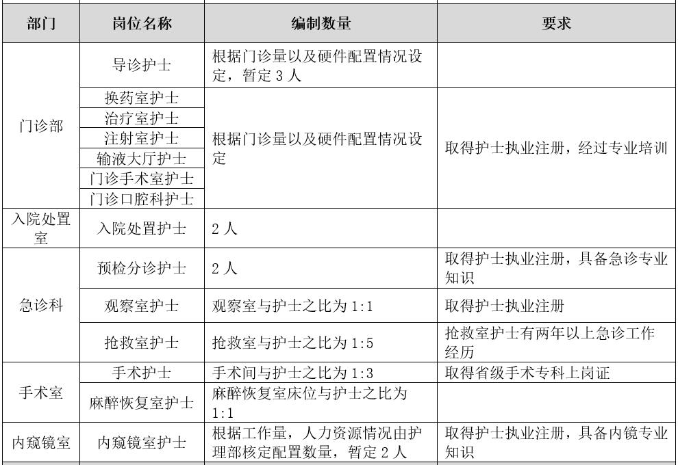 1、一般臨床科室、門診、醫(yī)療輔助科室等護理崗位的設(shè)置:以初級職稱為主,原則上不設(shè)中、高級職稱崗位。