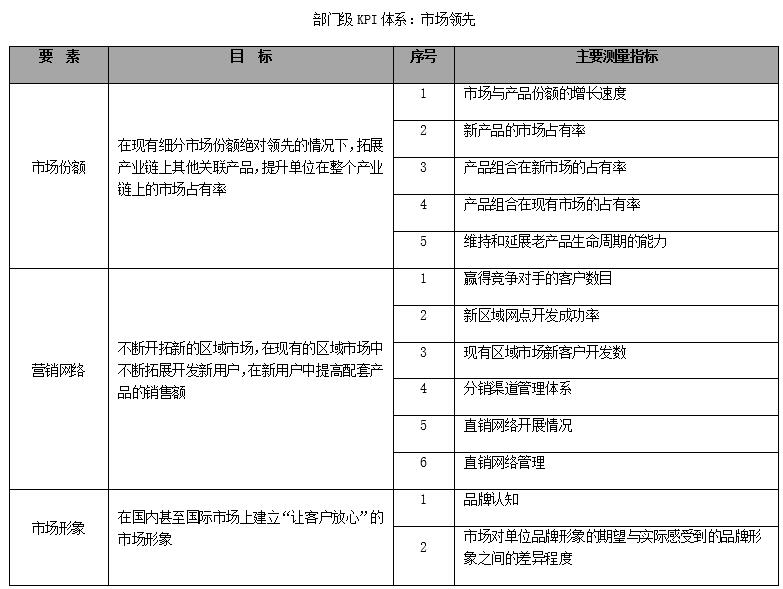 各部門的主管需要根據(jù)單位級(jí)的KPI建立部門級(jí)KPI,并對(duì)相應(yīng)部門的KPI進(jìn)行分解,確定相關(guān)的要素目標(biāo),分析績(jī)效驅(qū)動(dòng)因素(技術(shù)、組織、人),確定實(shí)現(xiàn)目標(biāo)的工作流程,分解出各部門級(jí)的KPI,以便確定評(píng)價(jià)指標(biāo)體系,如,根據(jù)單位級(jí)的“市場(chǎng)領(lǐng)先”戰(zhàn)略,確定部門級(jí)KPI。